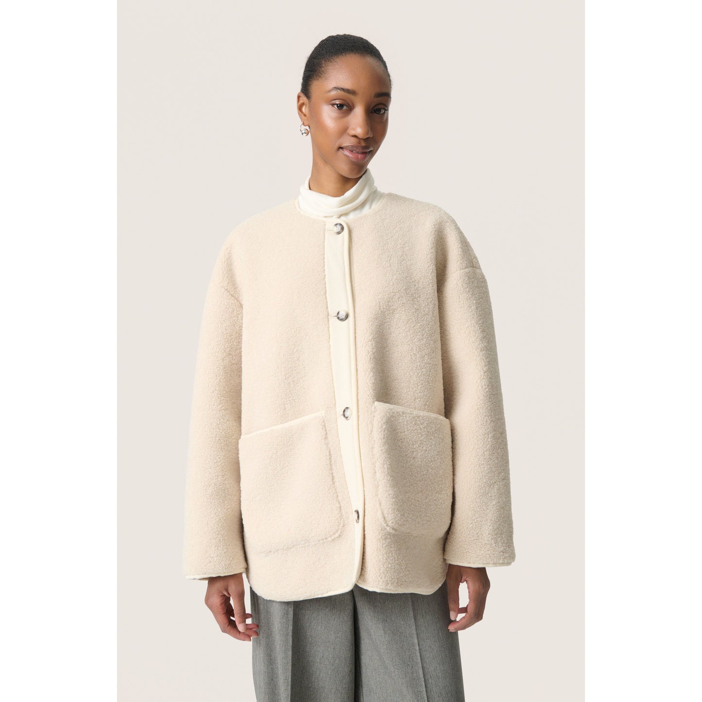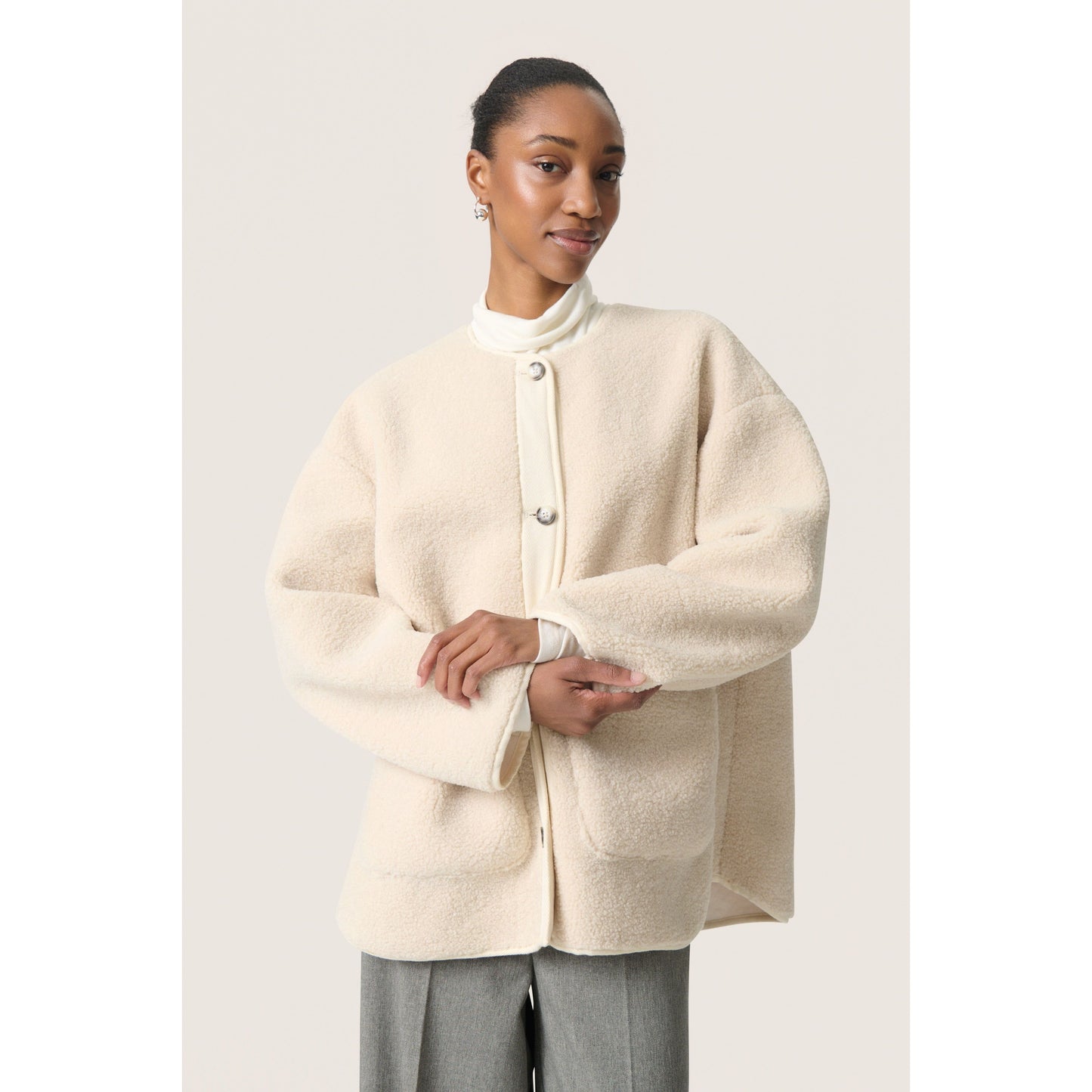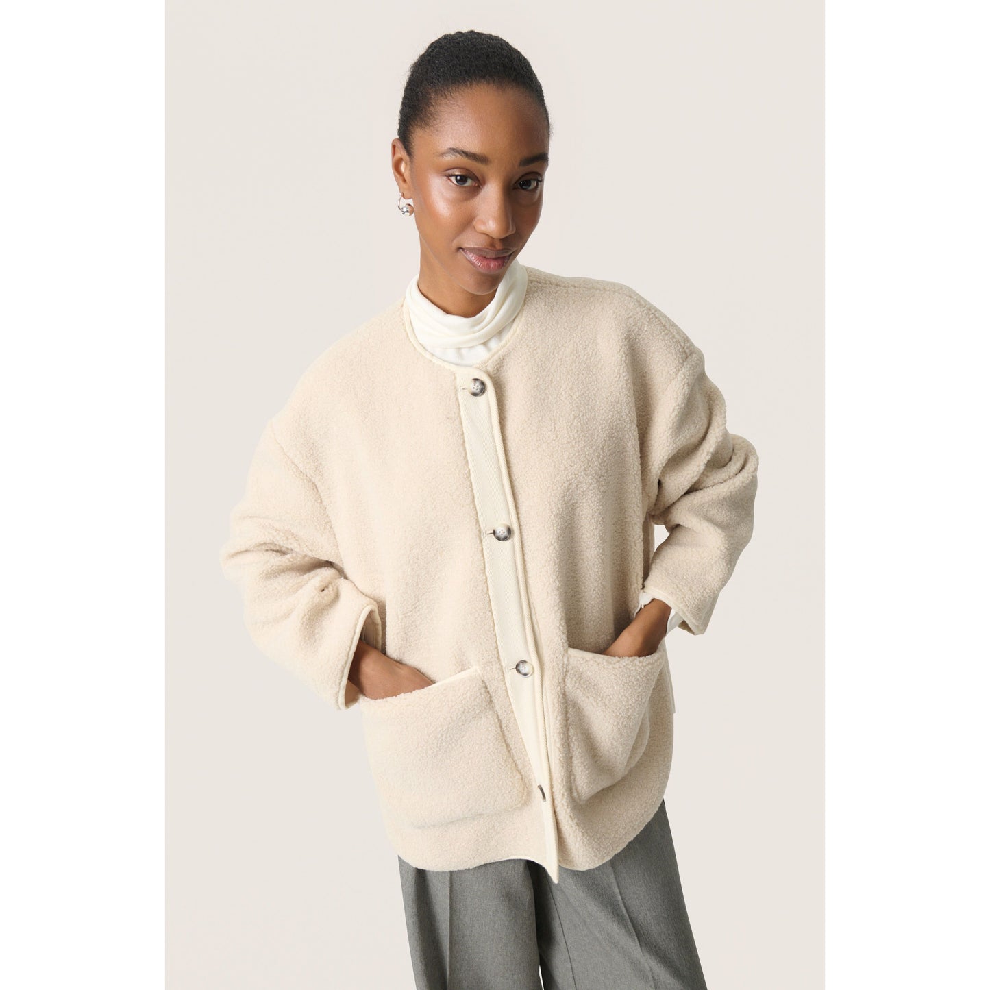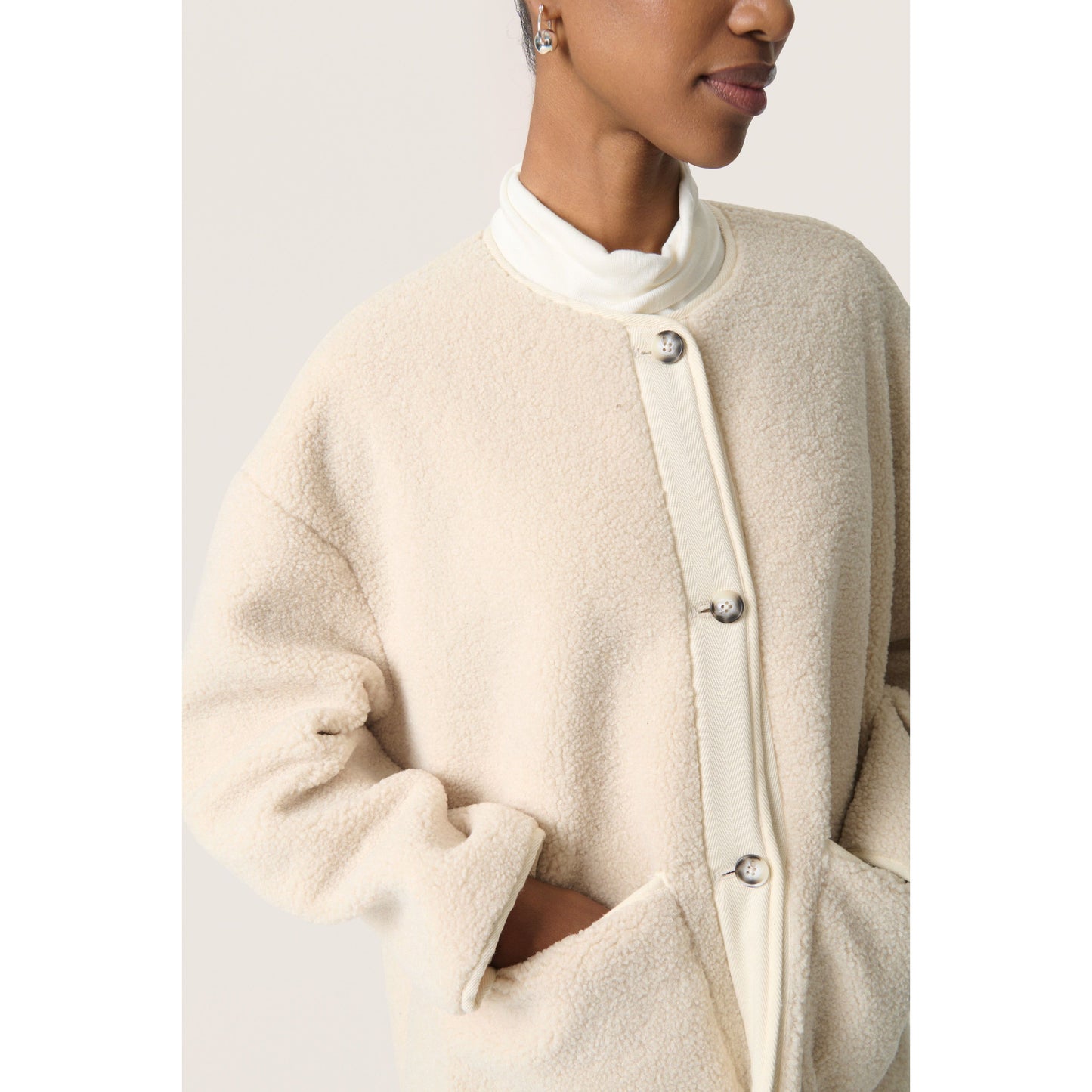 This oversized cardigan jacket is crafted from soft teddy-style fabric that offers warmth and comfort while keeping a modern, effortless look. Designed with a round neckline and button-front closure with contrast trim, it also features two large patch pockets. The hip-length cut and relaxed, oversized fit make it perfect for layering over denim or tailoring, creating an easy yet polished style.