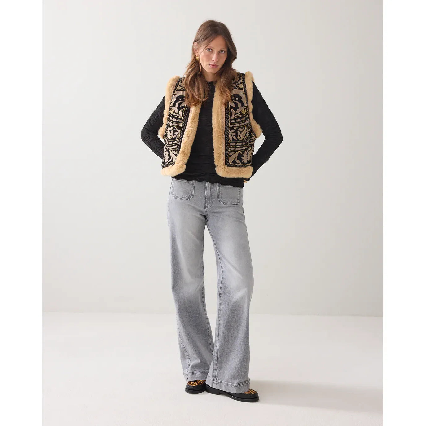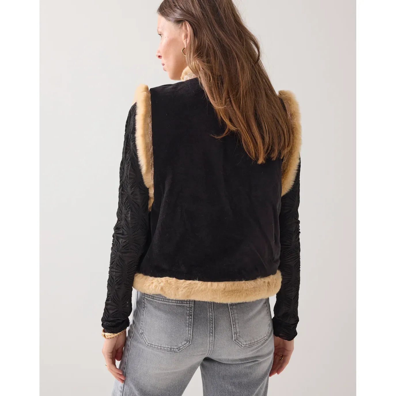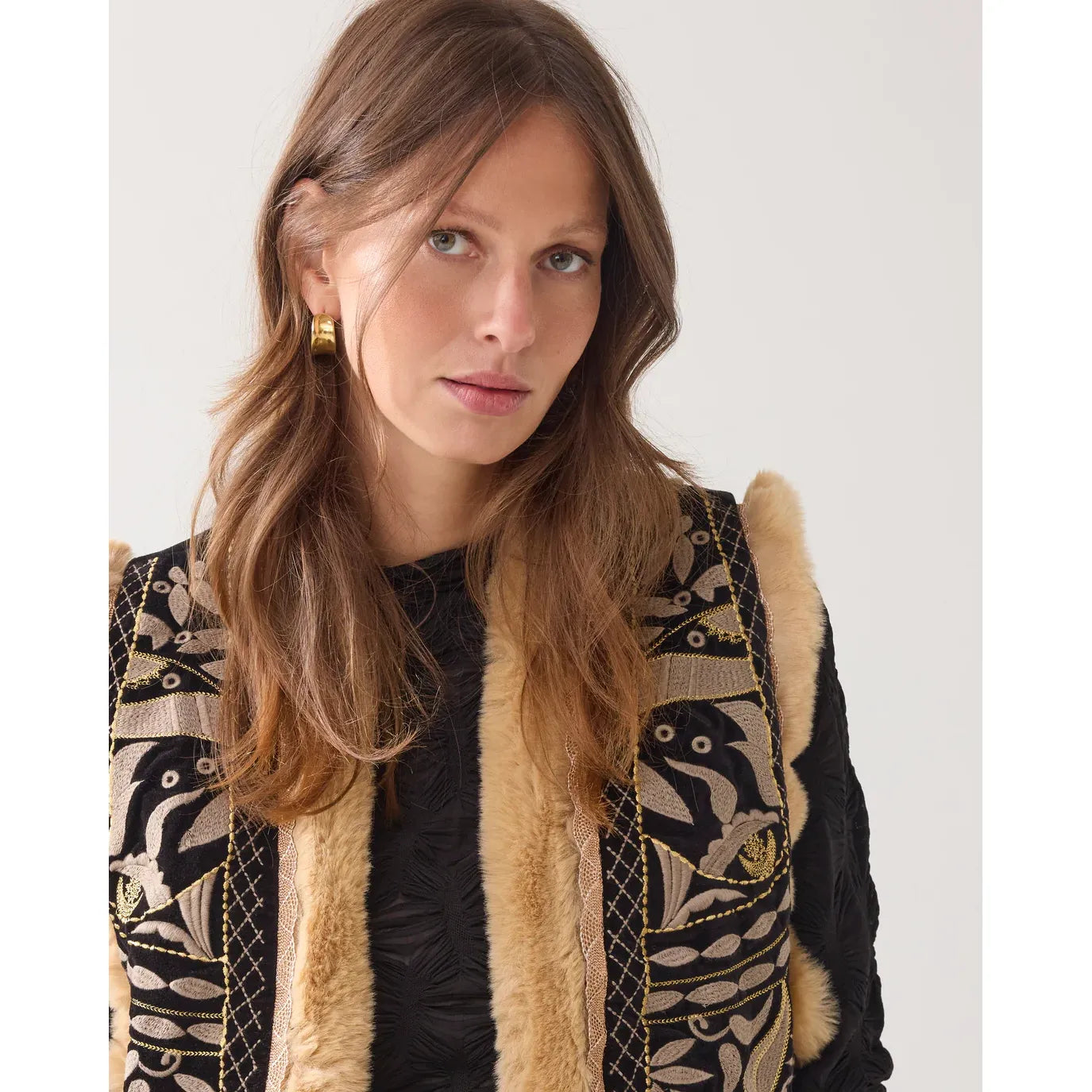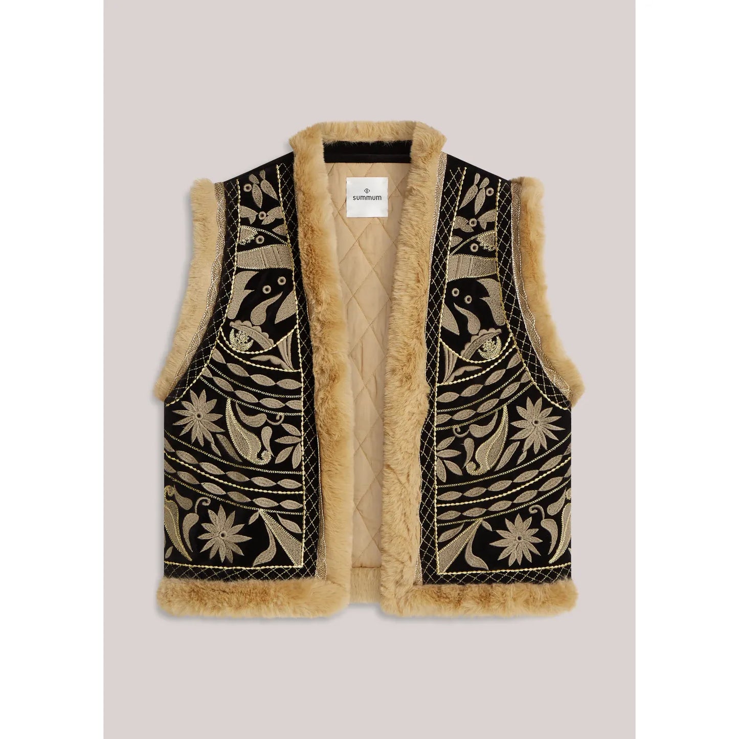 This striking Summum velvet gilet is designed with a soft quilted cotton voile lining and finished with plush faux fur trim for warmth and texture. The front is richly embroidered in a detailed lurex and ivory pattern, giving the piece a statement, artisanal feel. Lurex lace along the edges adds a subtle shimmer, while the sleeveless cut makes it perfect for layering over blouses, dresses or knits. A standout style that combines comfort with luxury.
