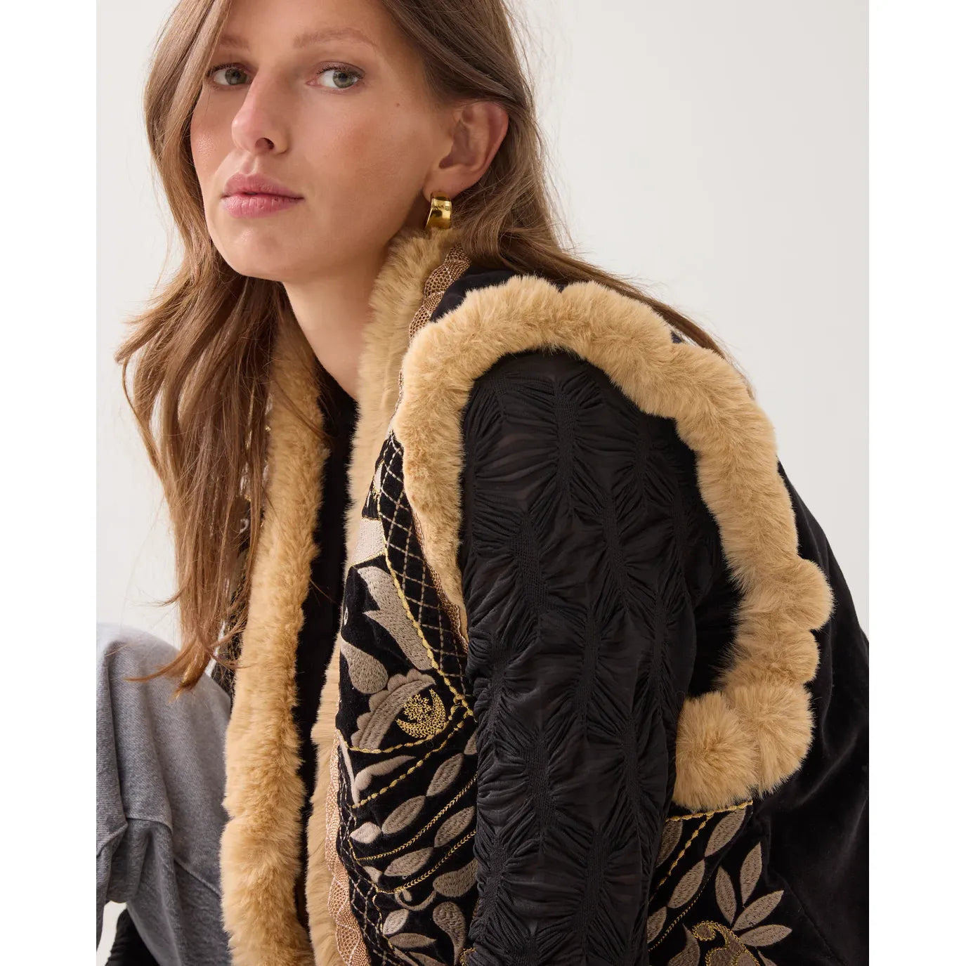 Crafted in velvet with faux fur trim, fully embroidered at the front, and lined in cotton voile for a smooth fit.