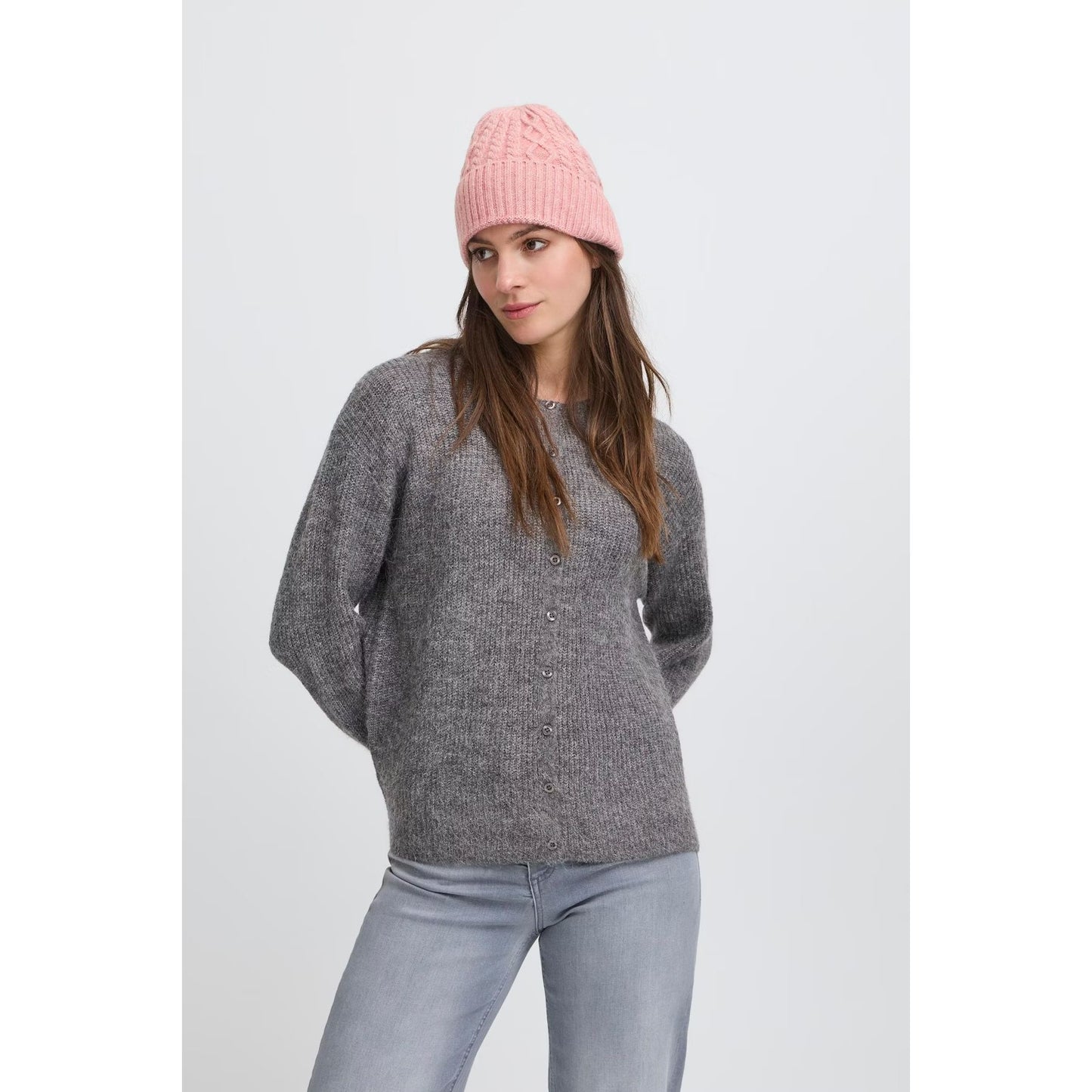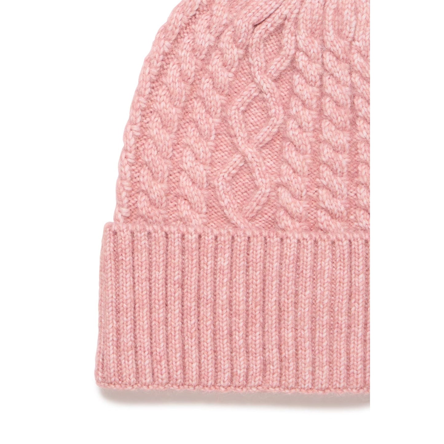 A cosy knitted beanie in soft pink with a classic cable-knit pattern and wide ribbed fold-up brim. The snug yet stretchy fit makes it a versatile accessory for cooler days.