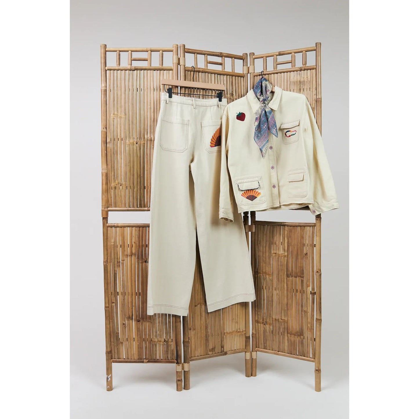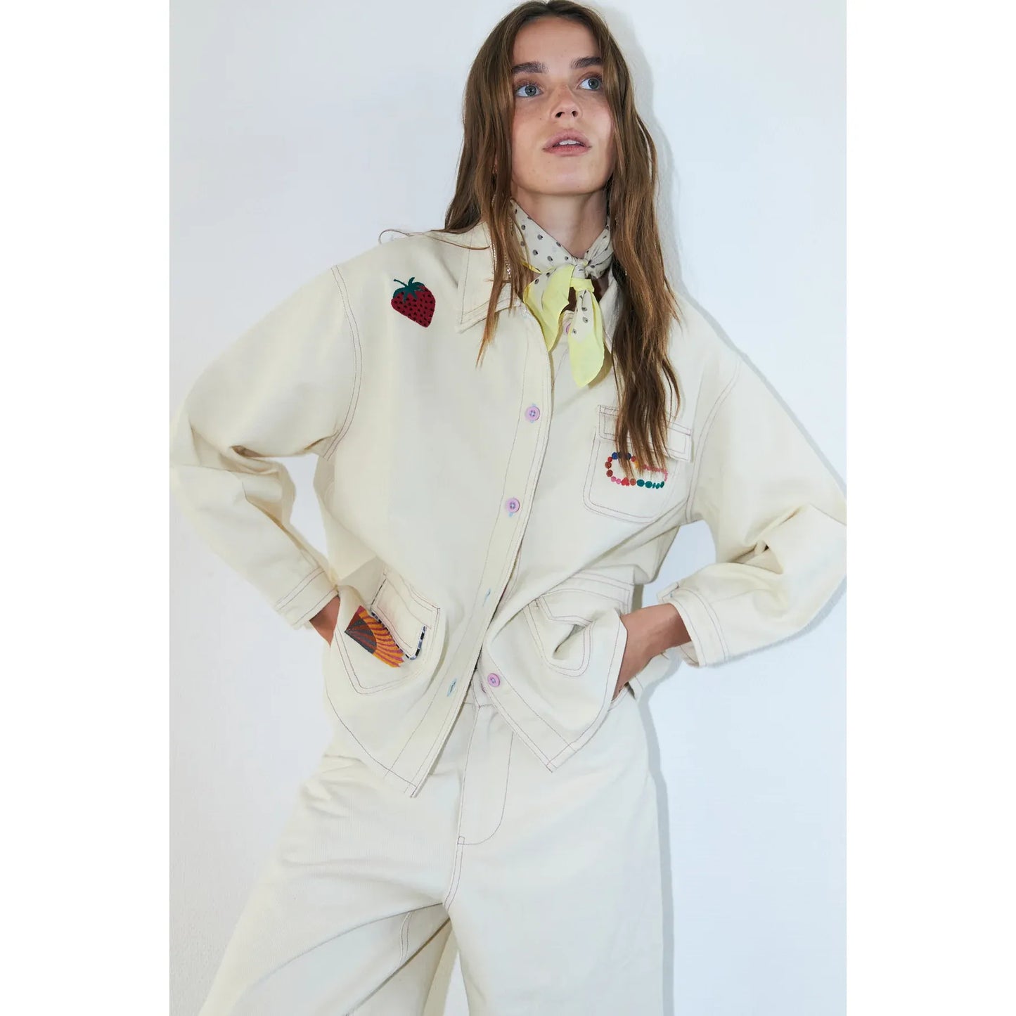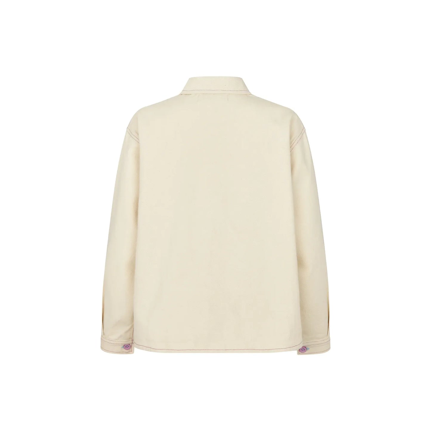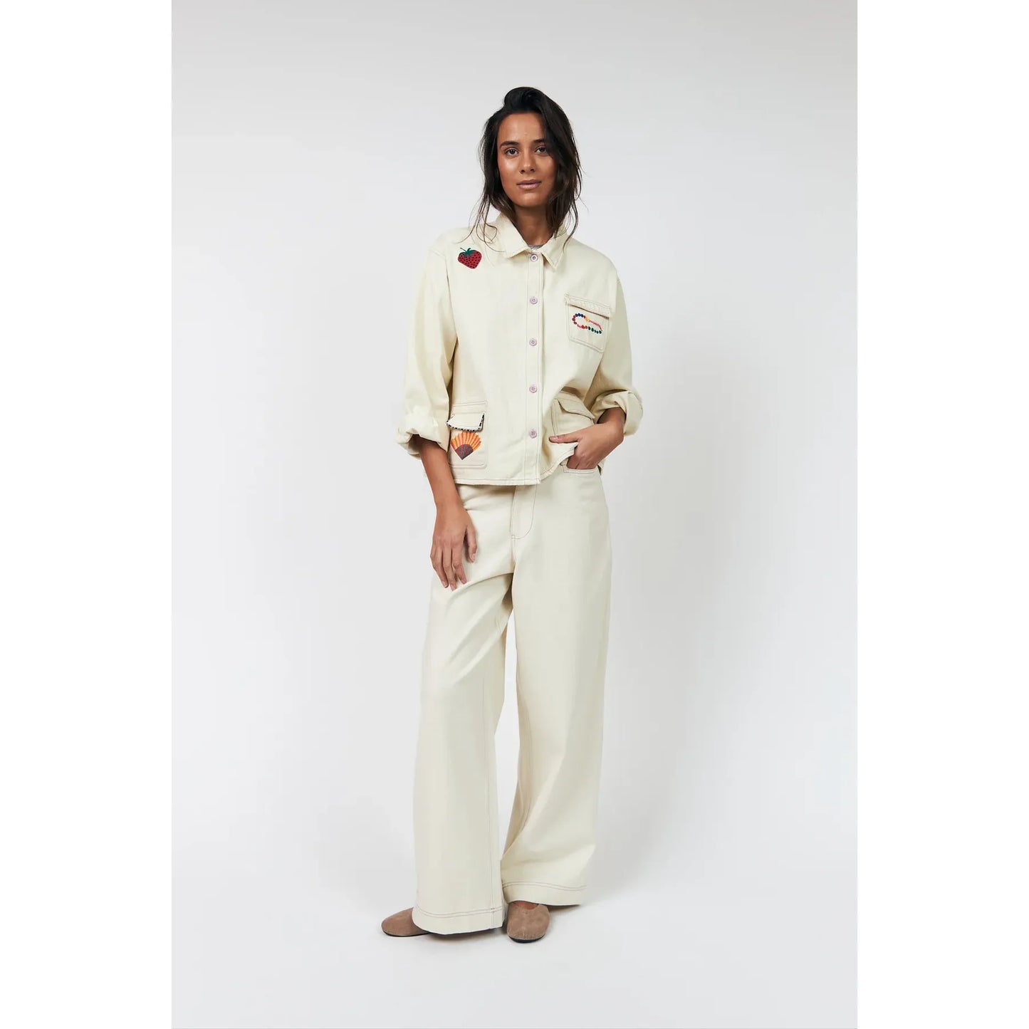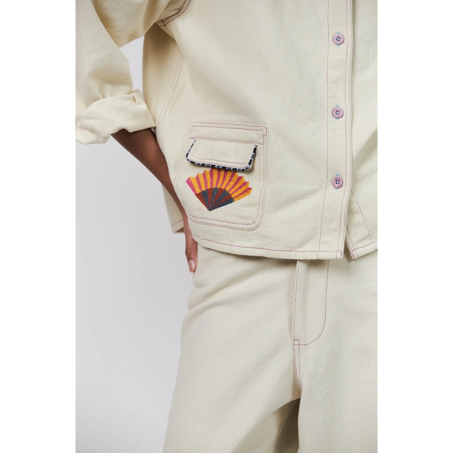 The April jacket by Lollys Laundry completes the look with a relaxed, straight-cut silhouette in soft cream cotton. Designed with playful embroidered details and contrast stitching, this jacket brings personality to an otherwise clean, minimal shape. Finished with practical front pockets and button fastening, it’s an easy layering piece that works beautifully worn on its own or styled with the matching Florida trousers for a coordinated set.
