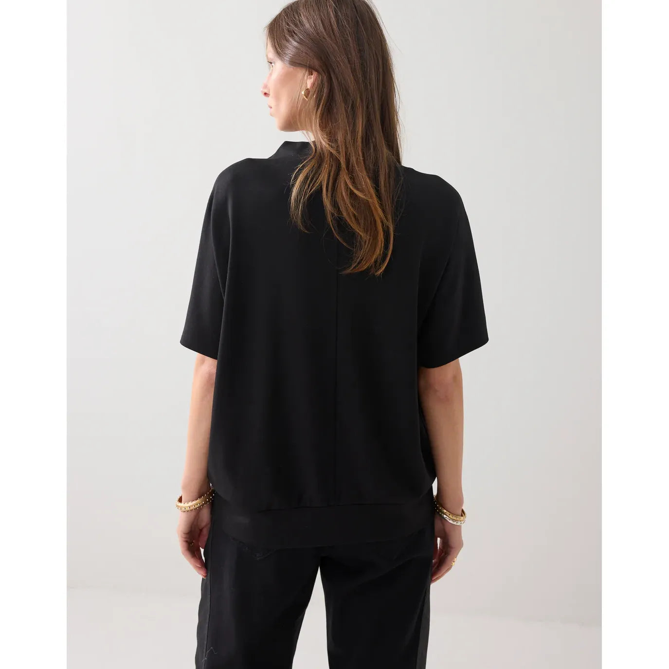 This oversized Summum top is crafted from a sturdy jersey fabric with a sleek, structured drape. A striking shiny viscose fringe runs down the front, adding movement and a touch of glam. The high cropped neckline and short sleeves balance the oversized silhouette, while the fitted waistband ensures a flattering shape. Perfect for pairing with tailored trousers or denim for an effortlessly modern look.