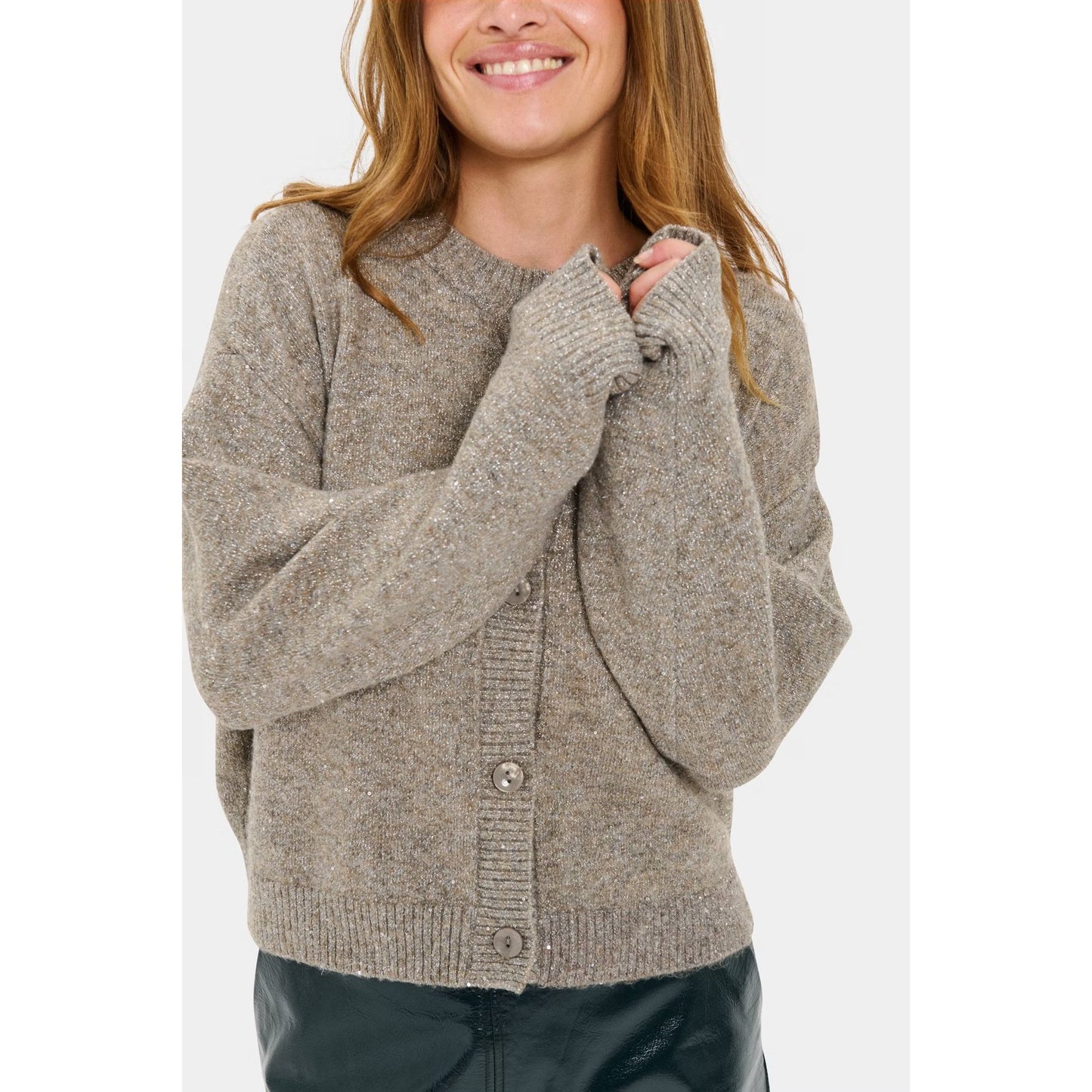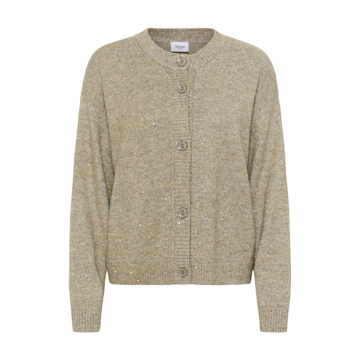 This Saint Tropez cardigan features a relaxed fit with a round neckline and classic button front. Designed in a soft, textured knit with subtle metallic shimmer, it brings easy elegance and warmth to your everyday wardrobe. The long sleeves and gently structured hem make it a flattering, versatile piece to layer over tees, shirts, or dresses for that effortless Scandi-chic finish.