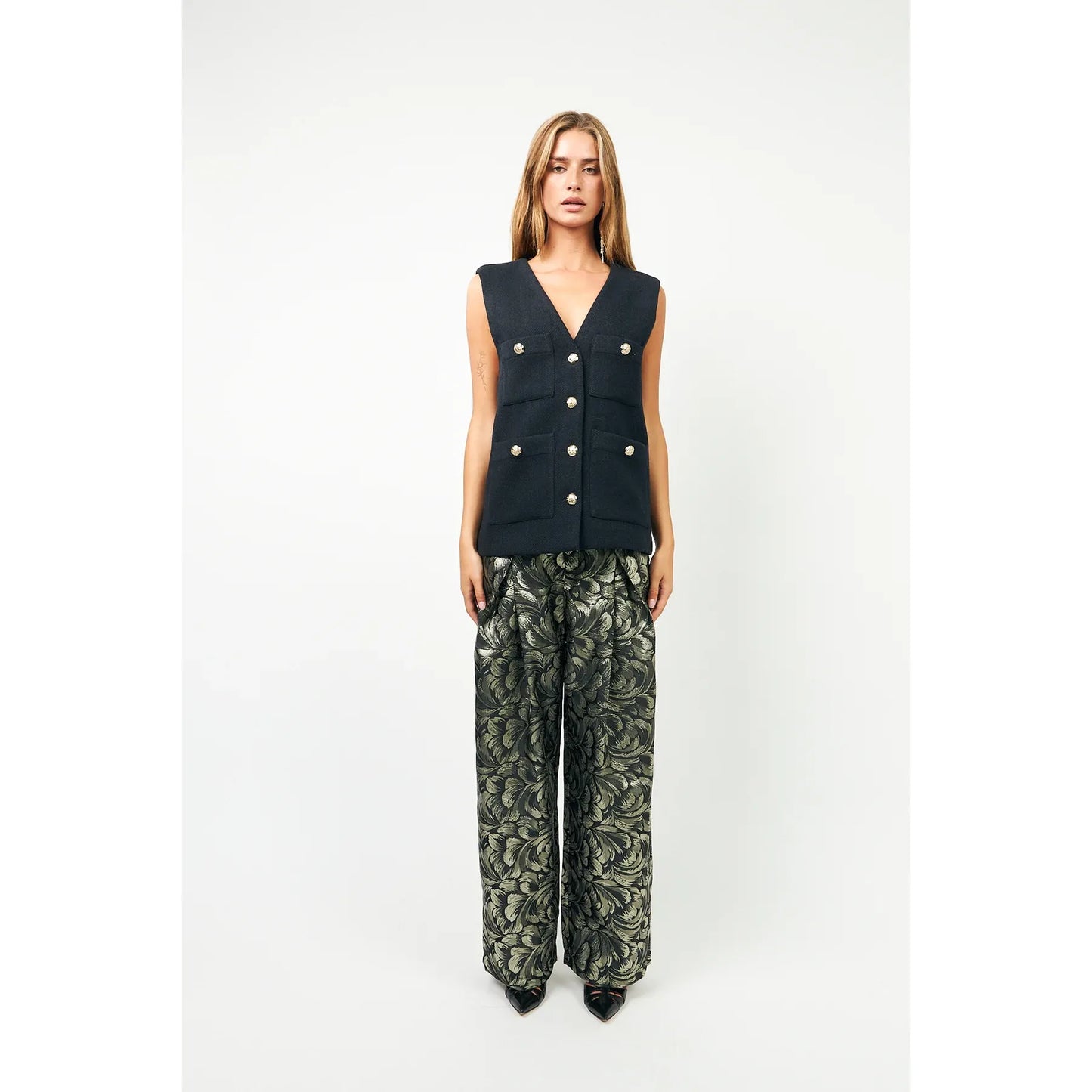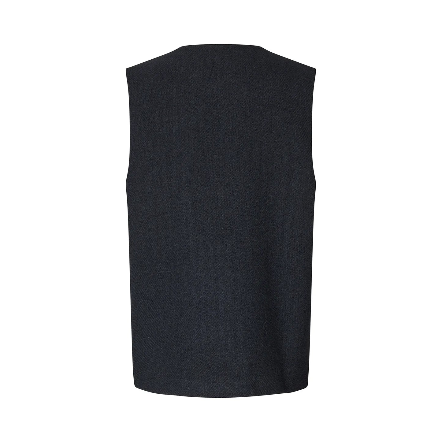 The EdelLL Vest from Lollys Laundry is a timeless yet modern layering piece. Crafted in a rich dark navy fabric with a softly structured shape, it features four front pockets and beautiful gold-tone buttons that give it a polished, exclusive edge. The deep V-neckline and relaxed fit make it versatile — wear over a crisp shirt or fine knit for a chic layered look, or on its own with tailored trousers for understated evening elegance.