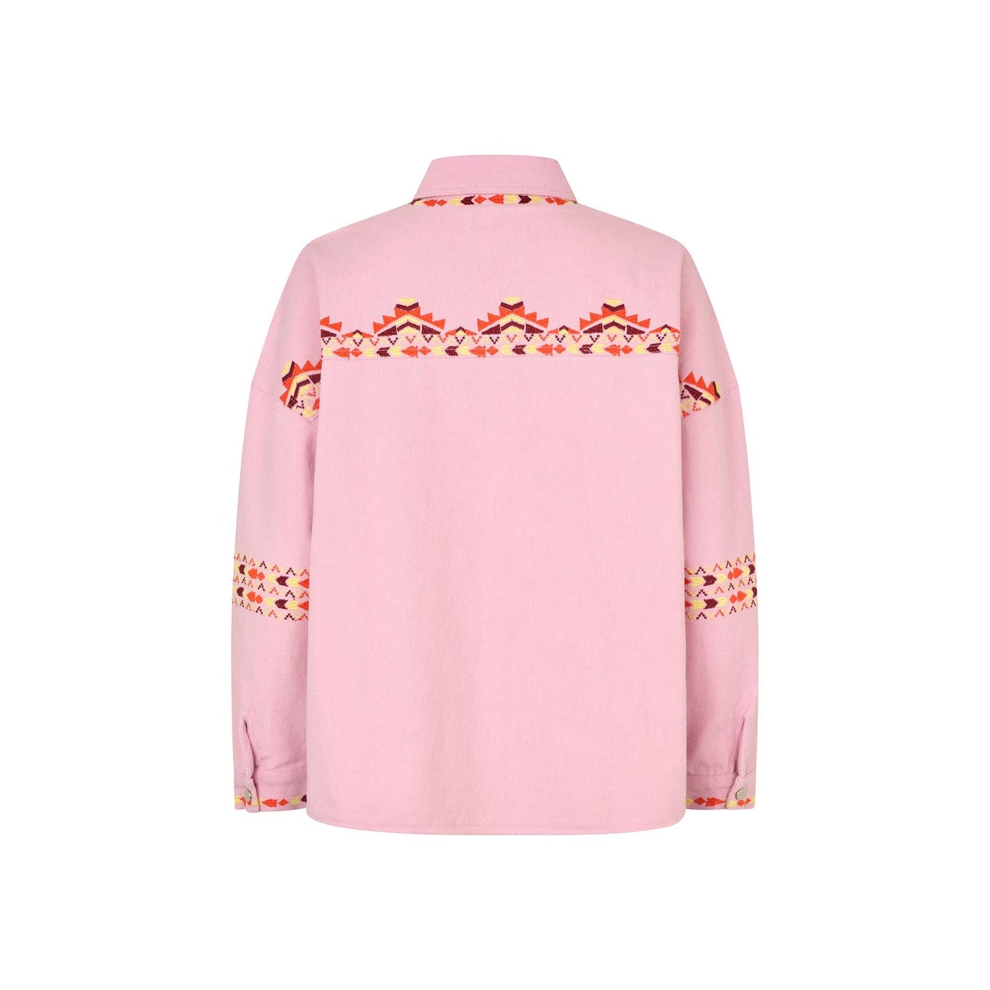 The VeidaLL shirt from Lollys Laundry is a joyful statement piece, designed in a soft pink denim with beautiful embroidered detailing throughout. Relaxed and oversized in fit, it’s one of those easy throw-on styles that still feels special, whether worn buttoned up or layered open.